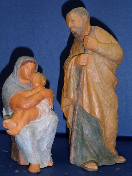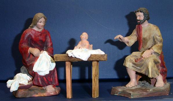 Este finde me he entretenido en fotografiar algunas de mis figuras y luego manipularlas para su edición. Os cuelgo algunas que no sé si habéis visto... primero de todo, algunas Sagradas Familias "ortodoxas". La primera foto es la joya de mis Misterios, realizada por Daniel padre hará unos 50 años, de 16 cm; la segunda es una maravilla de 20 de Andreu Muns (o sea, Muns hijo), no sé de qué época, dedicada a los que no les gusten los belenes que no sean estrictamente "hebreos"; y finalmente, lamento la pésima calidad de la foto, una composición de Delgado, de 12 cm., muy poco convencional, y para mí, preciosa.... a ver si os gustan....