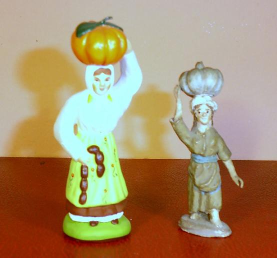 En el lote de los Reyes Magos adorando iban también un nutrido grupo de figuritas pequeñas, de "estilo Teixidor", unos cien años, de tamaño entre cuatro y seis cm., todas ellas de terracota. Os pongo la más interesante, una "mujer con calabaza" que va acompañada de otra "mujer con calabaza" de "Santons Didier" (de la Provenza, en Francia) que me ha regalado un amigo este verano. Lamento la mala calidad de todas las fotografías, pero es muy difícil hacer las fotos para figuras tan pequeñas, la luz es siempre insuficiente, el enfoque es complicado y si usas el flash quedan "deslumbradas" y si no, no se ven los detalles