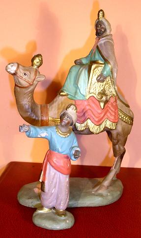 Estos Reyes Magos son tb de un "brocante" que vende fundamentalmente libros y revistas, con objetos de colección, en la calle Sepúlveda junto a la Plaza de Goya. Ya colgué unas fotos en su momento, pero he hecho otras y no resisto la tentación de colgarlas. Son figuras de molde, terracota, unos 40 años de antigüedad ¿catalanes?, 12 cm (cortos) el paje, que tiene una mano de plomo. Al final, el típico "Melchor" del Prado, recién comprado... para comparar, sí señor....