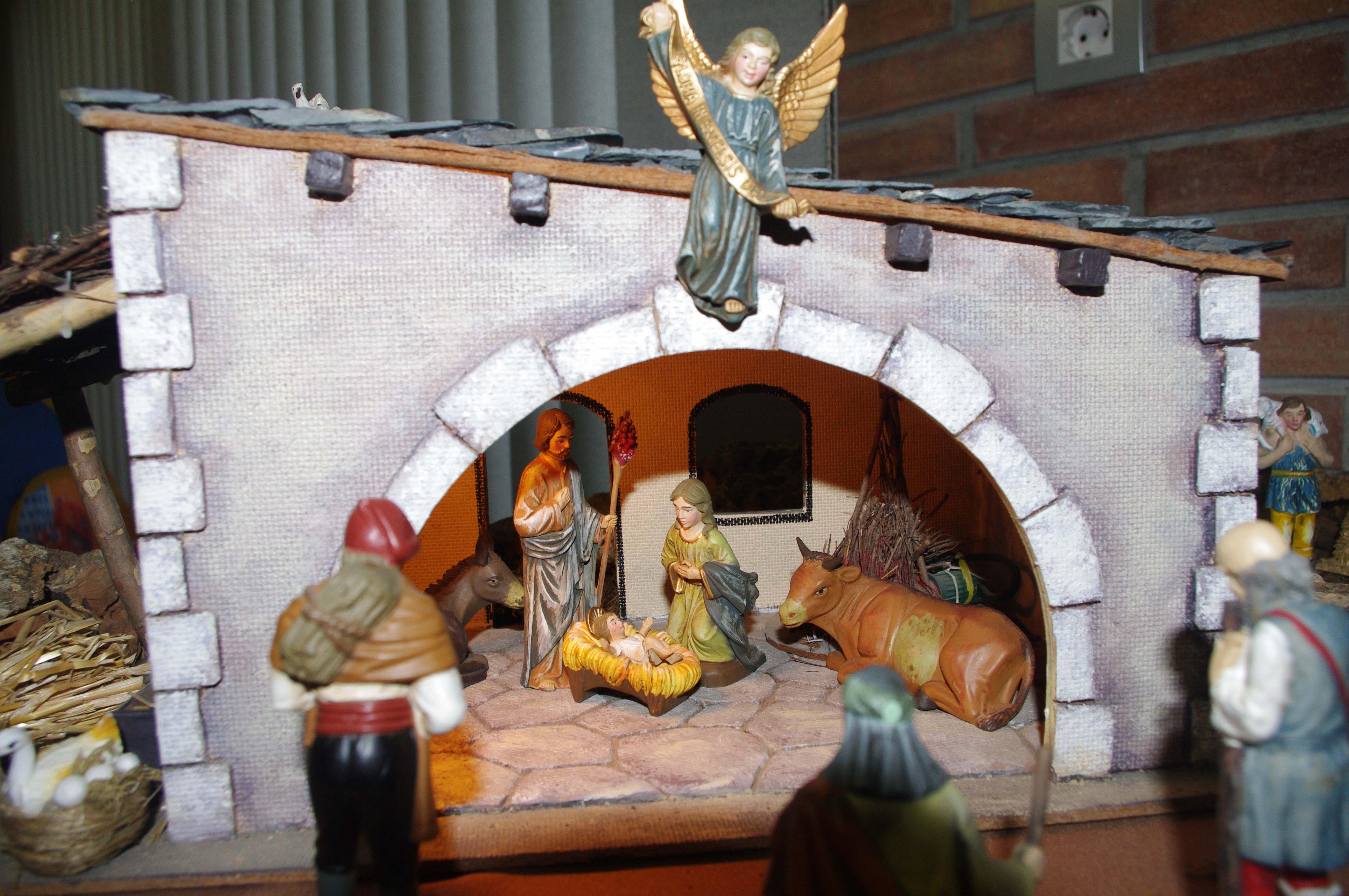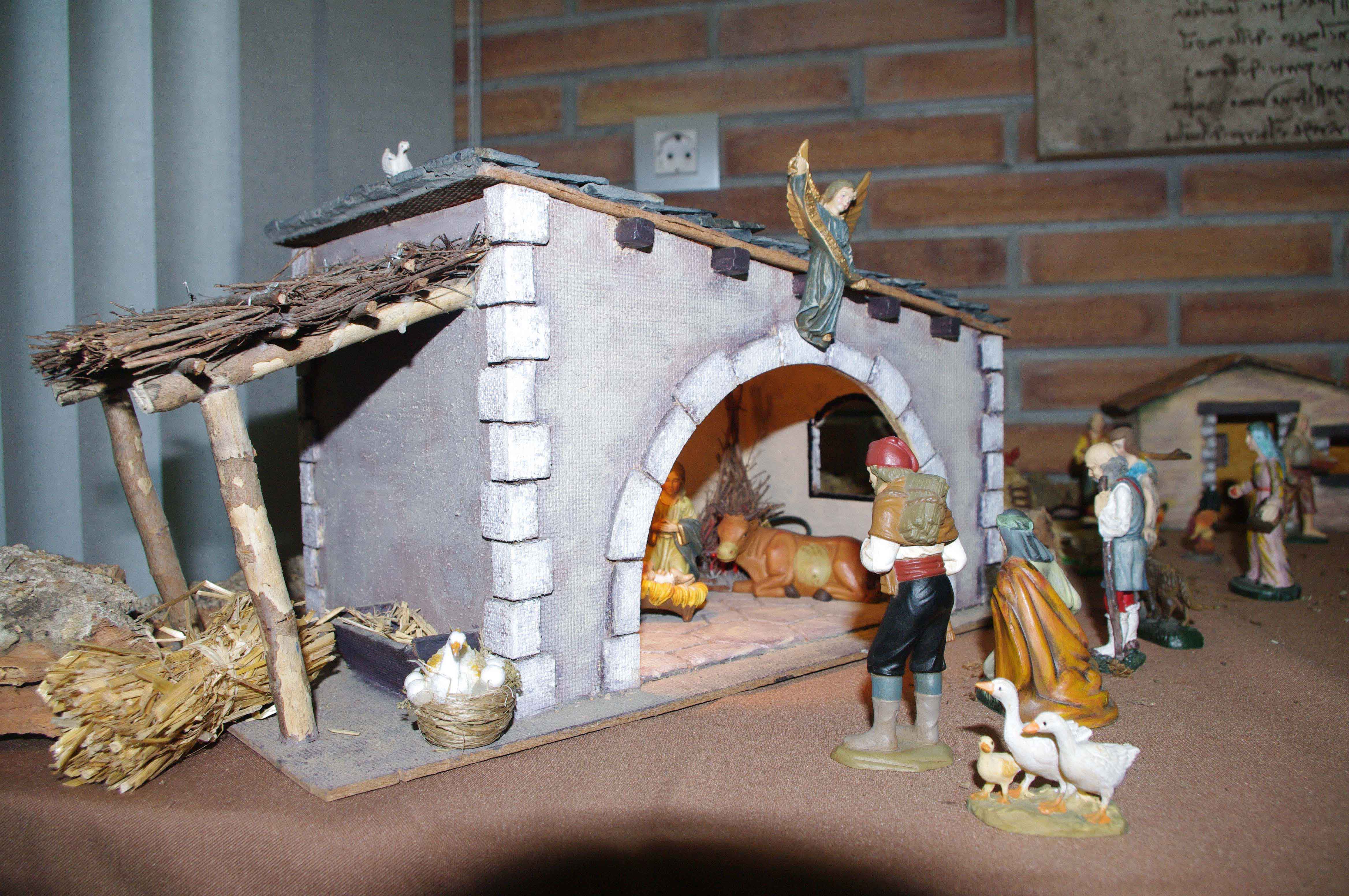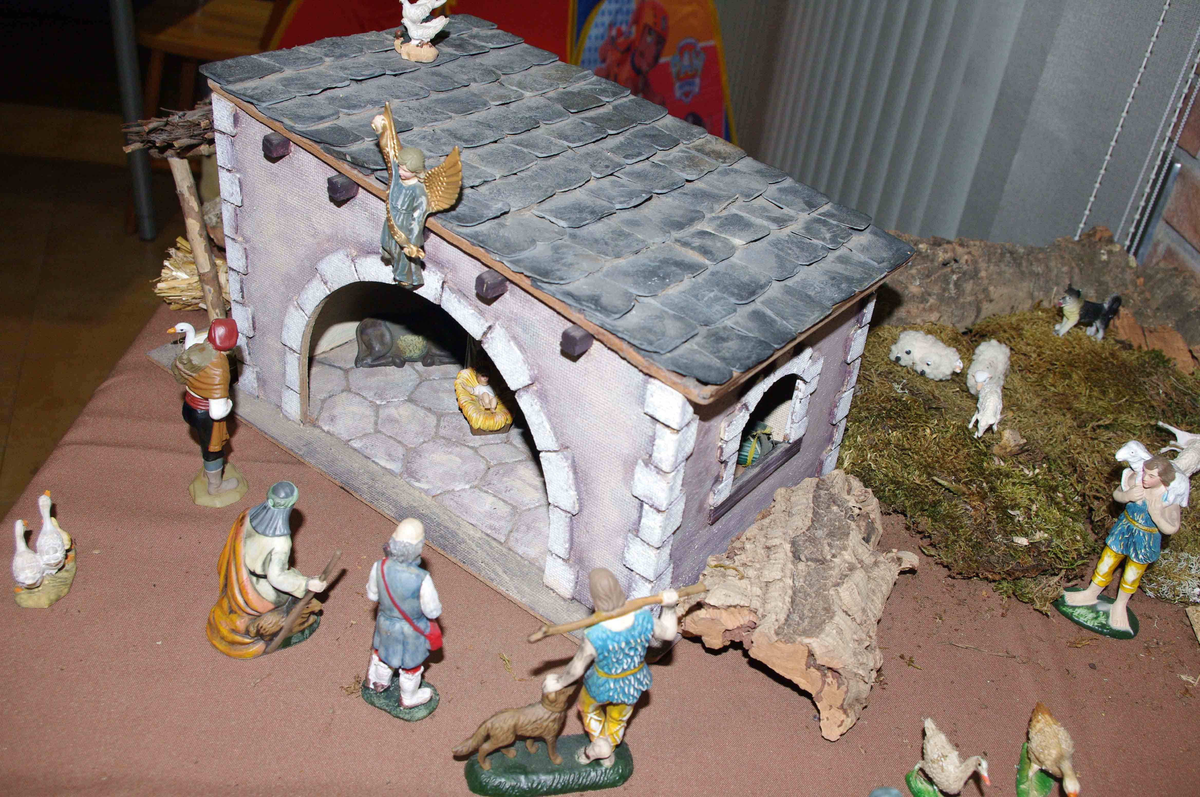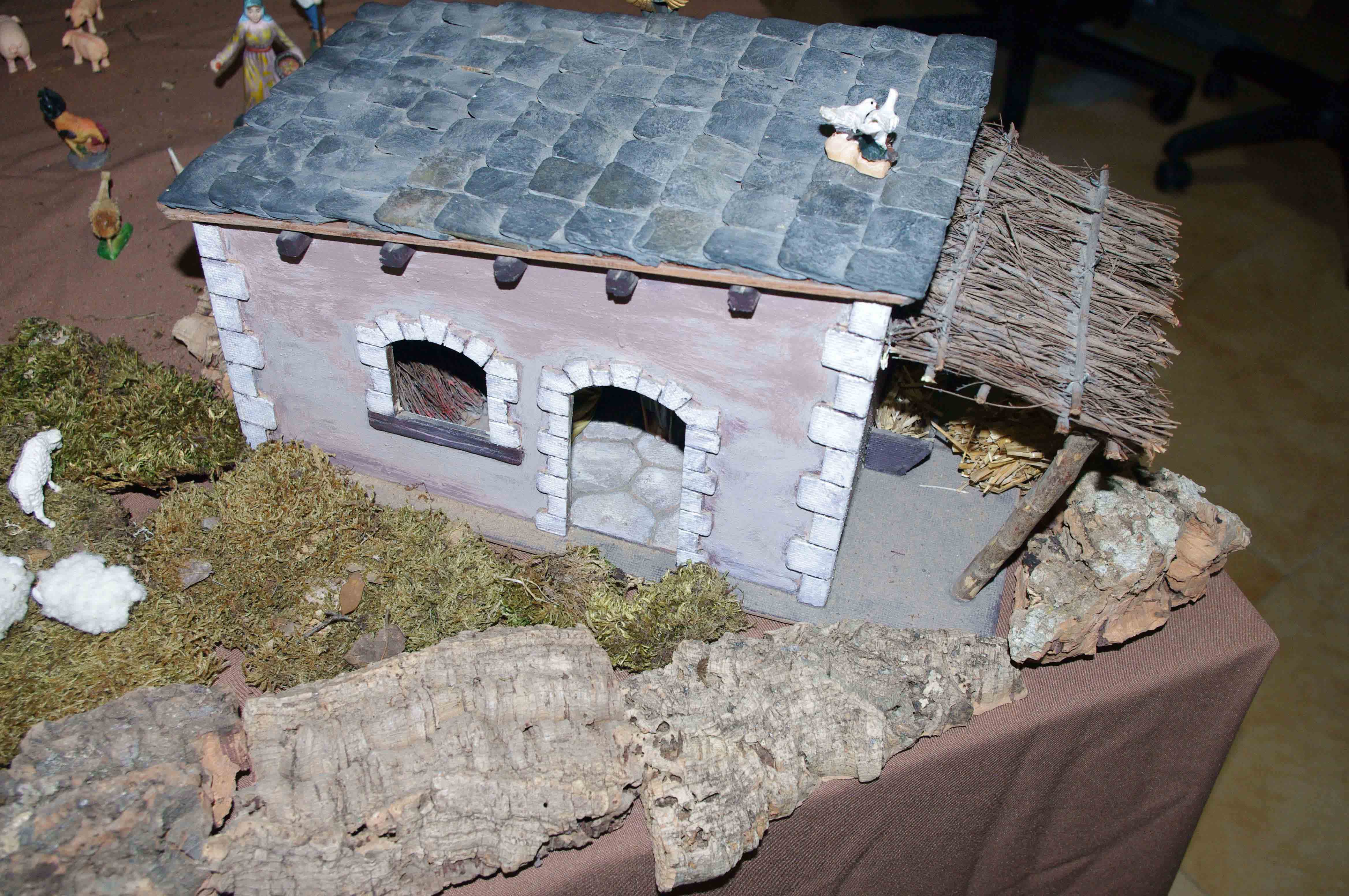 Cinco fotos del portal de Belèn, el tejado està hecho de pizarra y la estructura del portal con unos separadores que se usan para remontar pilas de bebidas ,ejemplo garrafas se agua de 5 litros ,de cola ,limòn o naranja de 2 litros que estàn en los palets en los supermercados.