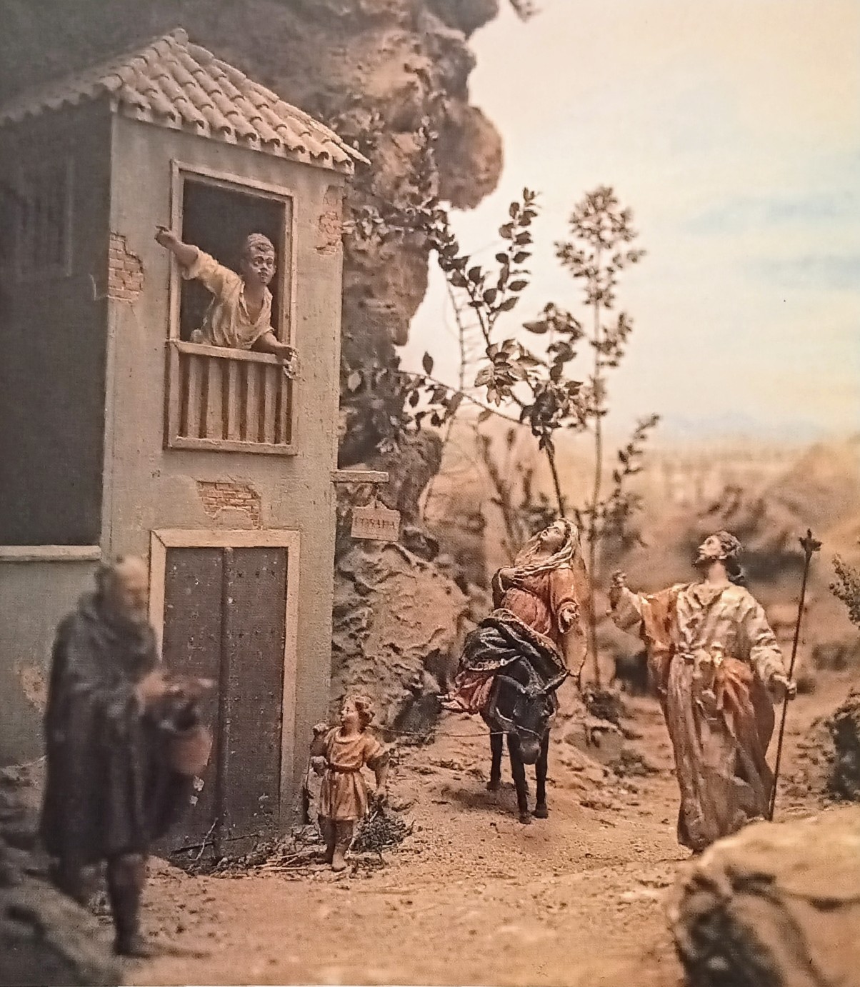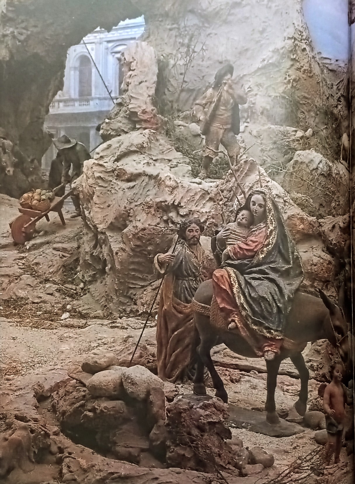 Texto del libro que acompaña a la foto: "El gran belén de Salzillo, conservado como una de las joyas del Museo que lleva su nombre, representa la plasmación ideal de la estética belenística española. Al pie, el episodio de la búsqueda de posada."