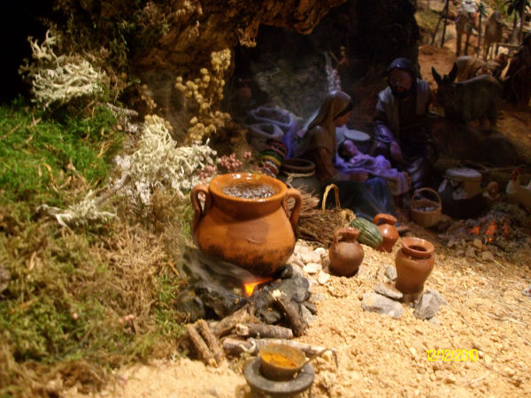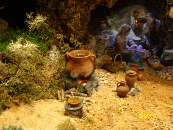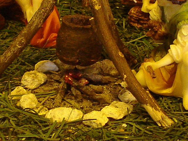 He realizado cuatro módulos -de los que he utilizado sólo 3-, de fogata (en porexpan y en madera) con bombilla parpadeante o con neones fijos y oscilantes(con cristales e Imedio, según el caso) (uno bajo una olla colgada de trípode, otro para la Anunciación y otro para un pastor -sólo hay uno fotografiado-).