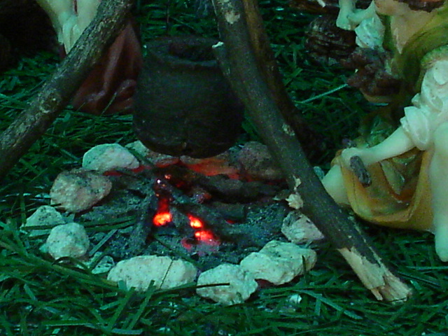 He realizado cuatro módulos -de los que he utilizado sólo 3-, de fogata (en porexpan y en madera) con bombilla parpadeante o con neones fijos y oscilantes(con cristales e Imedio, según el caso) (uno bajo una olla colgada de trípode, otro para la Anunciación y otro para un pastor -sólo hay uno fotografiado-).