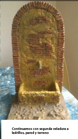 Primeramente, como siempre es costumbre, damos una capa de color base. Yo he dado en los ladrillos un color Rojo Ladrilllo con pintura acrílica y al resto lo he pintado con pigmento Sombra Natural Verdosa. Una vez seca esta capa, damos la siguiente verladura con Ocre acrílico a pincel semi seco, si bien he dado antes unos retoques a algunos ladrillos de azul intenso, marrón, naranja y amarillo, con el fin de que no sean todos iguales.