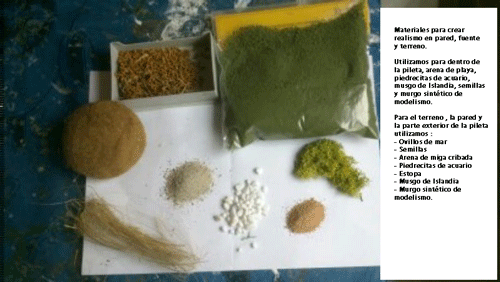 Ahora vamos a ambientar la construcción para lo cual vamos a usar varios materiales. Vosotros podeis utilizar los que queráis y los que sean mas apropiados al trabajo, ahora bien, tened en cuenta que cualquier cosa u objeto que quede dentro de la resina será imposible volver a recuperarlo; yo he utilizado los siguientes: