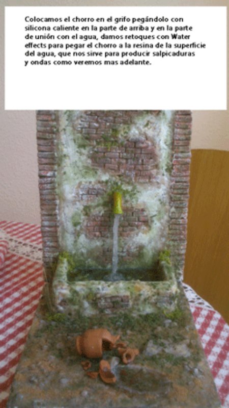 Ya tenemos la fuente pintada y le podemos colocar el grifo. El grifo lo he modelado con pasta Fimo Light, lo he pegado con silicona caliente para pintarlo después con acrilicos metálicos tales como Oxido y Latón y luego algunos retoques de verde para hacer el cardenillo y cubrirlo todo con un barniz cerámico de color amarillo, con lo cual se obtiene un aspecto de grifo de latón viejo.