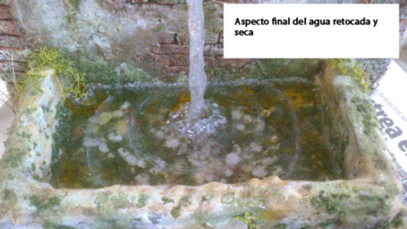 En general, la pintura una vez seca, se comporta perfectamente sin ningún tipo de problema al contacto con la resina de oclusión, es decir no se deteriora y permanece perfecta, asi como otro tipo de materiales y vegetación que podremos incluir en nuestros trabajos, pero si utilizamos pintura al óleo y ésta se encuentra fresca o recien dada, al contacto con la resina hace que se enturbie lo cual, si no queremos obtener el efecto de agua turbia, no deberemos utilizar pintura al oleo. Ahora bien, supongamos que alguien quiere realizar un arroyo que está surcado por un caballo, un mulo, o unas ovejas, cuyas patas están pisando en el fondo del pequeño arroyo y queremos obtener un efecto de agua turbia al paso del ganado, pues ahí tenemos la solución.