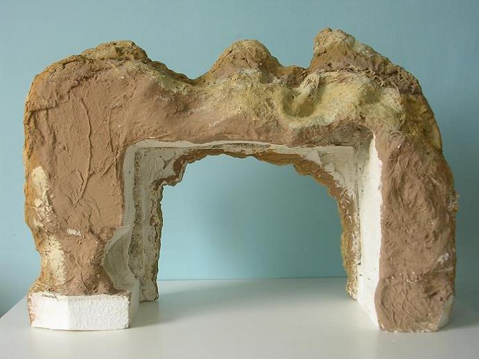 Cuarto: Antes de que se secara la escayola, desmenucé trozos de poliestireno expandido hasta dejarlo en las bolitas; estas bolitas las mezclé con escayola (no mucha escayola, la suficiente para que las bolitas pegasen bien entre sí) y por puñaditos las fui pegando en el montículo para formar salientes, grietas, oquedades… y así conseguir el máximo realismo.