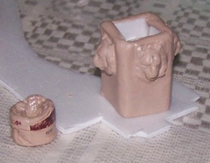 2- luego realicé la estructura, muy simple, de una bandeja de porexpan, y la recubrí con la masilla, dejando los agujeros donde van las cabezas.