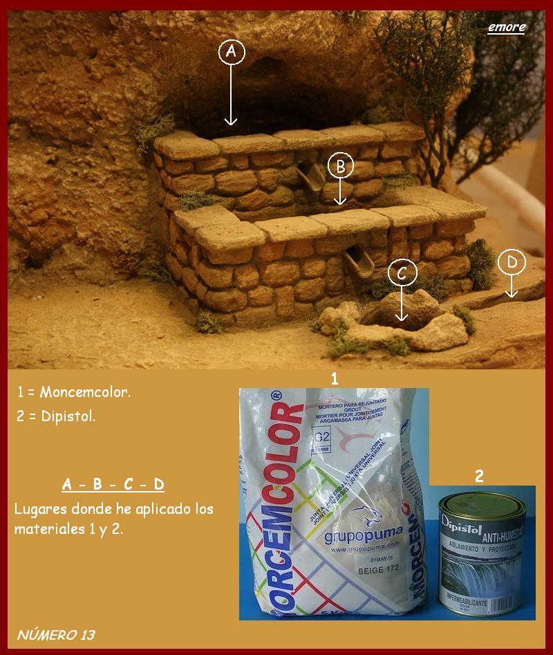 El interior de los recipientes donde cae el agua y el canal por el que sale, está hecho con el mismo poliestireno expandido que he construido el montículo, con una buena capa de mortero para el sellado de juntas de color beige 172 (MORCEMCOLOR). Una vez terminado y pintado con pintura plástica al agua el interior de los recipientes y el canal por donde pasa el agua, le doy dos manos de barniz (Dipistol ANTI-HUMEDAD IMPERMEABILIZANTE INCOLORO).