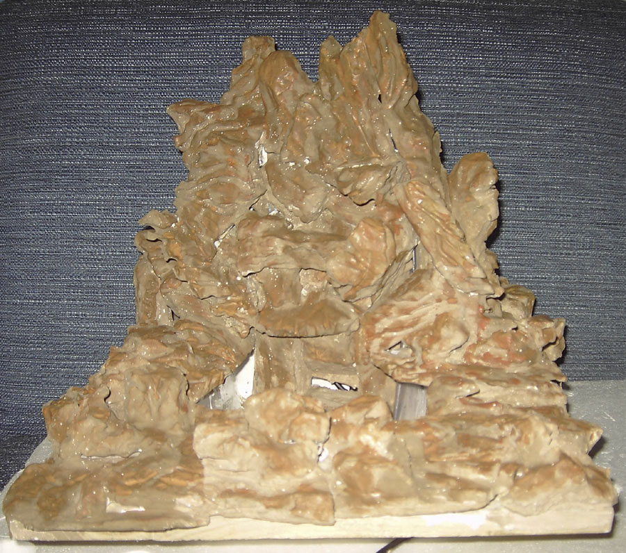 Ahora prepararemos la base de nuestro oasis de la misma forma... pegando trocitos de porex y los mismos pasos descritos anteriormente para la estructura de la fuente... haremos la estructura del oasis comprobando que encaja la fuente dentro de él.