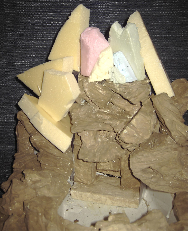 Restos de porexpan, pistola caliente de silicona, palillos de dientes, aquaplast, pinturas acrílicas... blanco, rojo inglés y ocre... arena de obra colada, tierras naturales Nerca Europ Alp de color ocre superior para teñirla, barniz marino Titan yate incoloro y musgo para decorar.