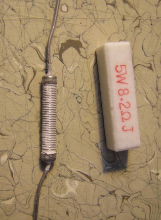 También he sacado una foto a la resistenia. Se trata de una resistenia cerámica a la cual la he sacado la resistenia que tiene dentro de la pieza cerámica. Después la he envuelto con tejido de fibra de vidrio. Un poco engorroso porque se desilacha; por eso lo he sujetado torciendo unos pequeños alambres.