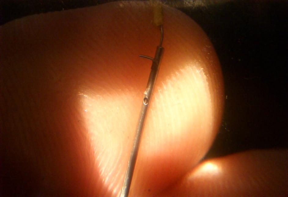 Según la foto que se ve el orificio, parece verse que la resistencia interior va roscada con hilo y la idea de la aguja de jeringuilla, es una buena opcion para realizar el tubito en cuestion.