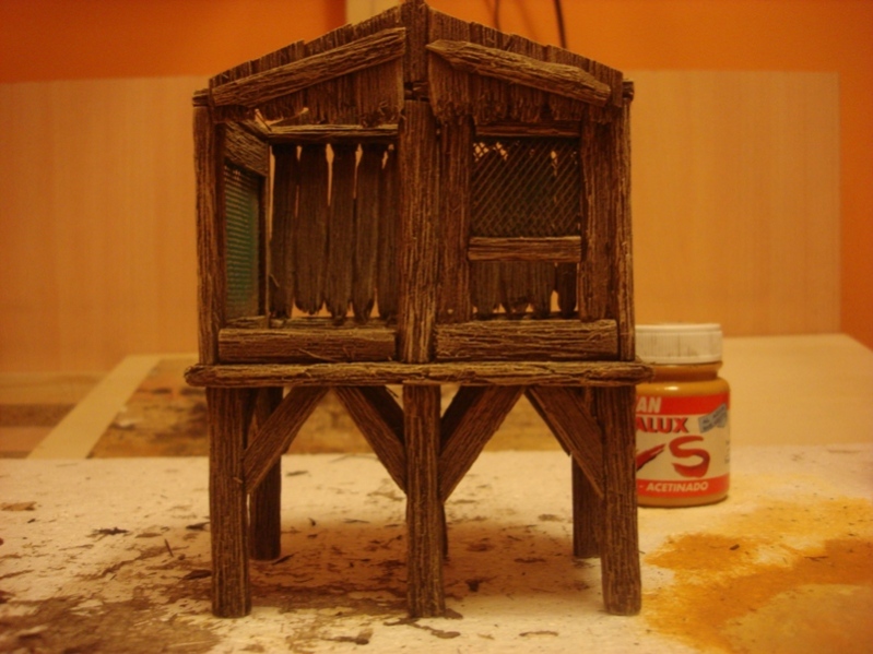 Los materiales utilizados han sido, madera de balsa, mosquitera, paja para suelos (de esa que venden en las tiendas de los chinos) cola blanca y súper glue. Las pinturas utilizadas, nogalina y acrílicos.