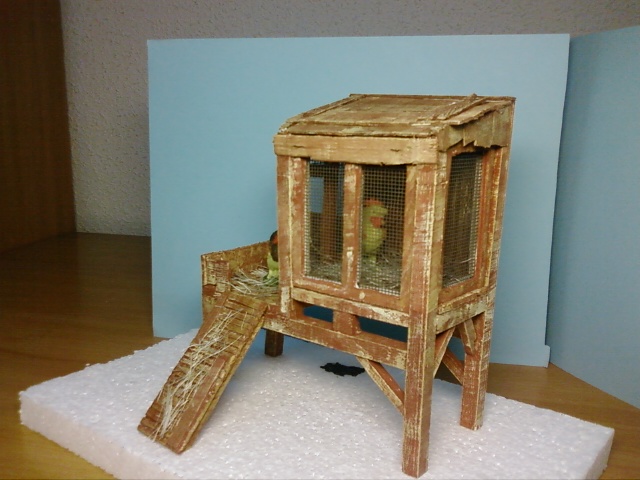 El gallinero de la foto no es mío :). Yo he hecho uno parecido a ese pero no tengo fotos de él, por eso he puesto la foto de este gallinero. Yo el mío lo he hecho con porex cortado y con un pincel de alambres que tengo le he hecho el cabado de madera. Imagino que el de la foto está hecho del mismo modo.