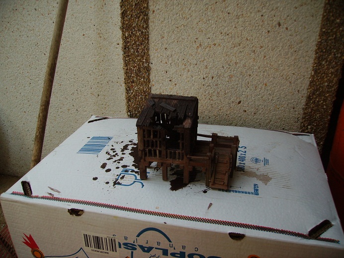 No sé si os acordaréis del gallinero que hice para el belén de mi casa estas navidades pasadas. Bueno, pues el caso es que ha habido un pequeño accidente. Se colo una rata en la habitación donde tengo guardadas las cosas de navidad, y la dhfehwfcjndh de la rata se ha puesto las botas con el gallinero. Lo ha roído un poco, y en un primer momento pensé en tirarlo a la basura. Pero después, pensando un poco más, se me ocurrió que podía reutilizarlo, pintando las partes de corcho que habían quedado al descubierto, y ponerlo como si estuviera en ruinas, o devastado por un pequeño incendio. ¿Qué os parece?