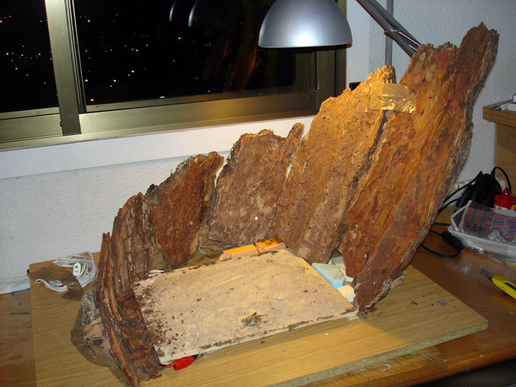 En efecto, es un material endeble, se cuartea con facilidad y no soporta flexión; antes rompe. La solución aplicada fue, sobre una tabla, atornillar una base de corcho y sobre ella atornillar por su base y sin forzar las lonchas de corteza de pino. Para evitar su rotura, los tornillos estaban provistos de unas arandelas grandes que repartían el esfuerzo y evitaron la rotura.