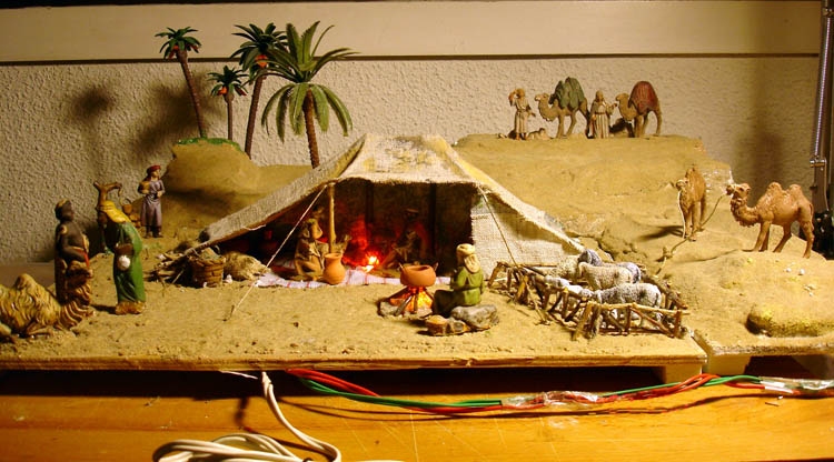 El bi-módulo ensamblado se montó en el belén dentro de una zona desértica construida sobre varios materiales de base (corchos, poliestireno, papeles) a base de una tela empapada con cola blanca arenada copiosamente.