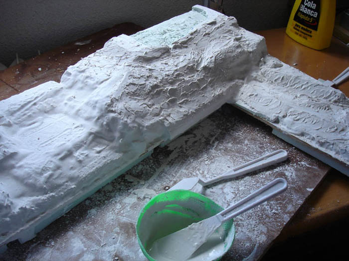 1 - Basado en experiencias anteriores los primeros tanteos consistieron en poner escayola en la montaña desértica que ya habéis visto y pintarla con pinturas de arena o piedra. Las pruebas se hicieron con varios tipos de pinturas acrílicas y el resiultado fue bastante bueno. Sorprendería a más de uno.