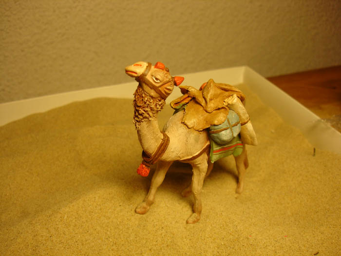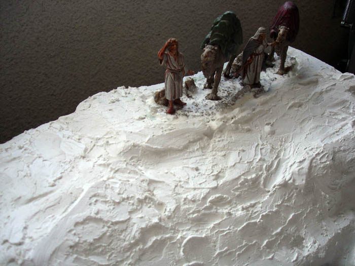 3 – Para su instalación en el Belén tuve que situarla en un desierto mayor. Aquí ya con la experiencia de tantas capas y capitas simplifiqué el tema y la instalación consistió en colocar una serie de corchos, cajas, papeles, etc, para conformar la superficie de un desierto y, encima una tela cualquiera, empapada con agua con cola blanca. En el intermedio en que se secaba y se modeaba el terreno, la rocié con la arena directamente. Y el resultado fue bueno. Bueno, rápido y seguro. Ya se que se acostumbra a poner arpillera o tela de gallinero etc., etc, pero no fue necesario. Seguramente porqué cada cosa o aplicación tiene sus ámbitos y la regla general no aplica en todos ellos.