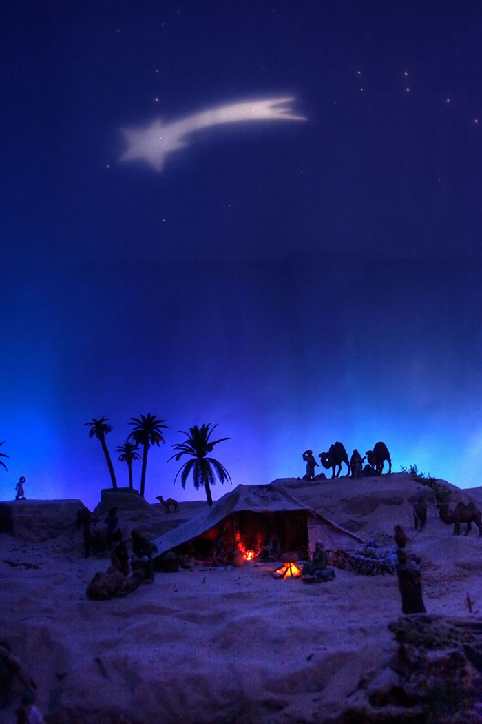 Por último, y te prometo que no vuelvo a distraer tu atención, ya sin "coñas" , darte mi opinión acerca de los corderos en el sentido de que no veo ningún tipo de anacronismo o, mejor dicho, de paradoja en cuanto a su presencia, ya que si consideramos, como parece ser, que eran poblaciones seminómadas (no abandonaban sus campamentos) y era parte del clan familiar la que llevaba a trashumar el ganado hacia las escasas dehesas del desierto, sería totalmente verosímil la presencia de ovejas en los campamentos aunque, eso sí, se trataría de otro tipo de ovejas distintas a las que estamos acostumbrados a ver en nuestros belenes. Además, según se observa en la fotografía final que has puesto - a la derecha de los camellos que hay encima de la loma- se observan unos matojos tullidos por el sol capaces de proporcionar alimento al ganado.