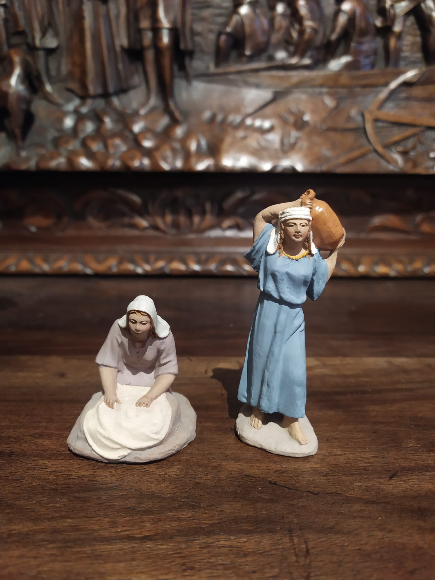 Este verano, dandole vueltas al espejo y a los apuntes para uno de los nacimientos de Malkior, aparecieron por el foro unas figuras que podrían dar solución a lo que venía rondando desde hace meses por mi cabeza: una Anunciación de 8cm. Acompañada de un pastor de 8,5cm que gracias a un forero y amigo, me puso en contacto con otro forero que las tenía en venta.