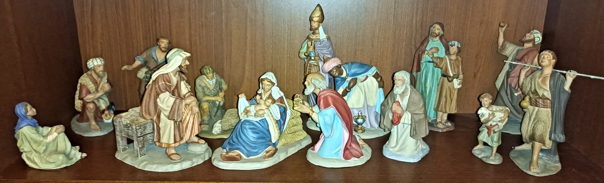 Ahora totalmente al revés, figuras de 11, casi todas adquiridas por mí. Me gusta especialmente el nacimiento catalán y la Sagrada Familia de Pamplona. En cambio, el tió que hay en segundo plano, obra reciente, no es muy acertada en alguno de sus personajes, especialmente una niña robótica con brazos demasiado grandes. Son muy interesantes los dos pastores dormidos, que serían de la anunciata, pero que creo que vienen de las figuras de pasión, son apóstoles del Huerto de Getsemaní.