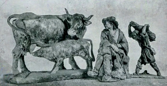 Por un lado, se distingue claramente la ya mítica y comentada figura de Vaca y ternero , una interpretación realizada por el joven Venanci a partir de la escultura decorativa de Pierre-Jules Mêne . Por otro, la imagen permite contrastar y confirmar una afirmación que ya planteé en 2022: junto a dicha figura se encuentra un pastor con rasgos claramente “Amadeuizantes”, que remiten a la influencia de Pau Xacó amigo de la familia y seguidor del estilo del maestro Amadeu en los primeros años de Vallmitjana.
