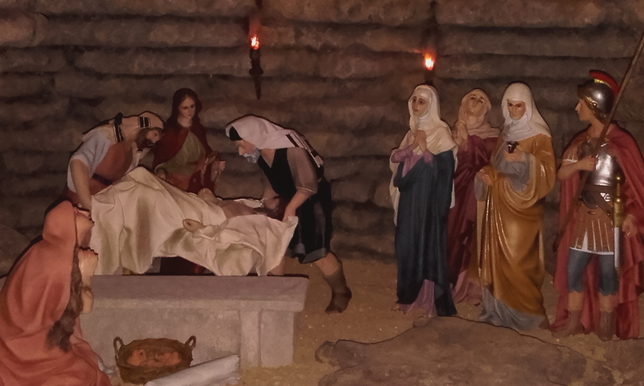 La Asociación Gaditana de Belenistas ha representado este año, en su ya tradicional gran diorama de pasión, el Santo Entierro de Cristo y para ello ha querido introducir al espectador dentro del sepulcro para contemplarlo en primera persona. El grupo escultórico lo forma José de Arimatea con Nicodemo depositando a Jesús en el sepulcro junto a San Juan que sostiene la corona de espinas y María Magdalena arrodillada junto a ellos. Detrás se encuentra la Virgen María, María Salomé, María Cleofás sosteniendo y contemplando los tres clavos y junto a esta el centurión romano Longinos. A través de la puerta del sepulcro se observa la guardia romana encargada de custodiarlo para evitar que robaran el cuerpo de Jesús, las murallas de Jerusalén y las tres cruces, ya vacías, en el monte Calvario. Estará expuesto al público de forma gratuita hasta el domingo de Resurrección.