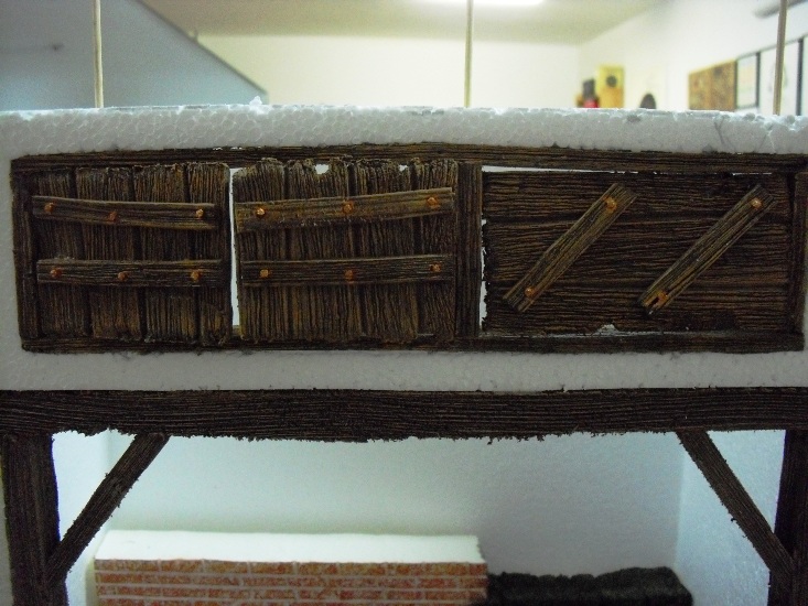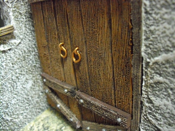 Lo que imita a los remaches de las puertas son los trocitos de palillo que pongo para que se quede mas fijo con la cola, como queda cortado en plano, le pongo un poco de pintura metalica en plata o en cobre.