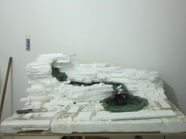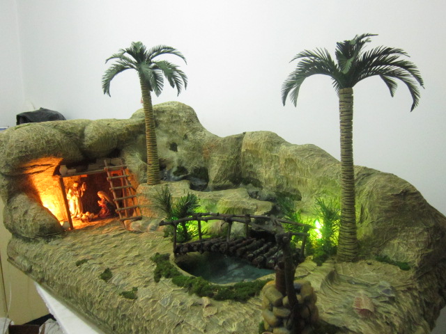 Hola buenas noches este pesebre esta elaborado en icopor, el rio lo conseguí ya elaborado en fibra de vidrio, al icopor luego de darle forma le di textura forrándolo con papel de cocina y colbon.