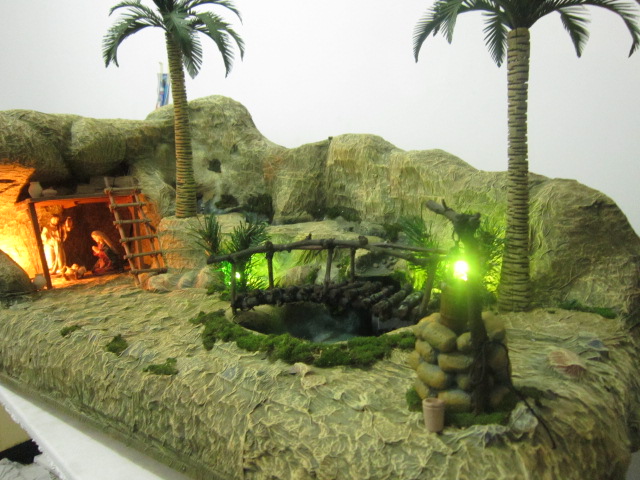 Hola buenas noches este pesebre esta elaborado en icopor, el rio lo conseguí ya elaborado en fibra de vidrio, al icopor luego de darle forma le di textura forrándolo con papel de cocina y colbon.