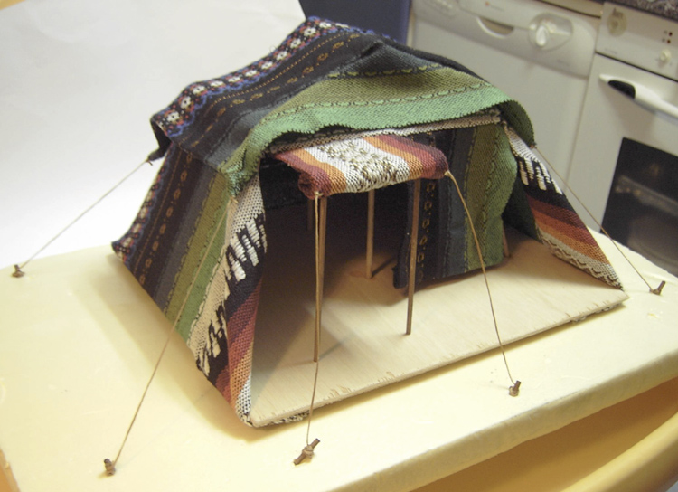 HAIMA. Materiales: Tablas de madera de cajas de frutas, varilla de madera de 4 mm. de diámetro, palitos de brochetas (estacas y soporte telar puerta), telas, hilo encerado (para coser zapatos), nogalina, loctite... Realización: Cortar tabla-techo, base y demás palos-pilares de nuestra haima. Cortar too los palitos de brocheta para hacer las estacas y los soportes de la “puerta”. Hacer con taladro los agujeros, los A torcidos hacia el exterior y los B rectos. Teñir piezas y pegarlas. Así ya tenemos la estructura de la haima. Cortar la tela a la medida adecuada y coserla. Colocar tela encima de la estructura. Por debajo esta grapada a la tabla. La tela de la puerta esta enrollada en un palito de brocheta. Cortar hilo encerado para las cuerdas. Por último, Coser las cuerdas a la haima y atarlo por el otro extremo a las estacas. Ya tenemos nuestra haima. Saludos. P: Sí queréis podéis ponerle too a la tela como dijo angel-gabriel barniz o porcelana liquida. Yo no lo he puesto.