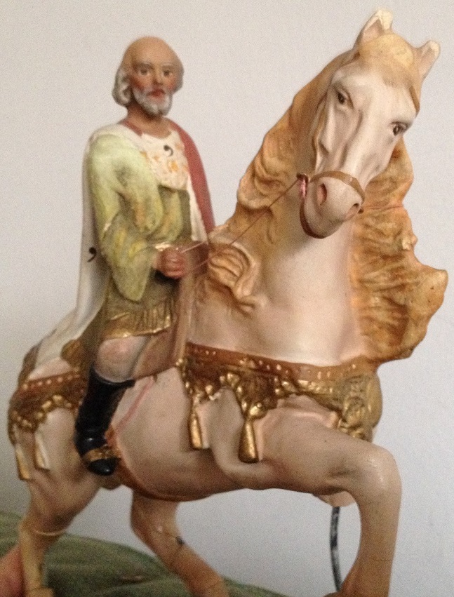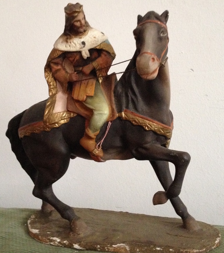 He buscado un poco más en internet sobre figuras de Olot y he encontrado fotos de algunas idénticas a las que he puesto, como es el caso del rey sobre el caballo blanco, y otras en la que la postura y el tema son iguales pero los rostros y el pintado difieren, como es el caso del trampero y de un burro que no puse en las fotos pero también iba en el lote.