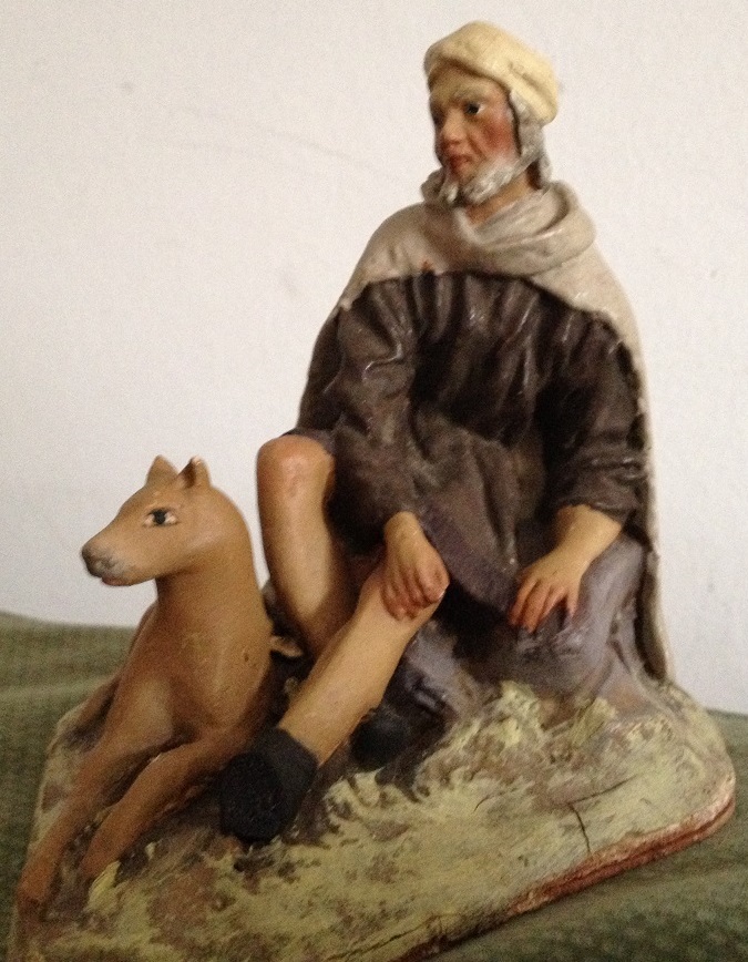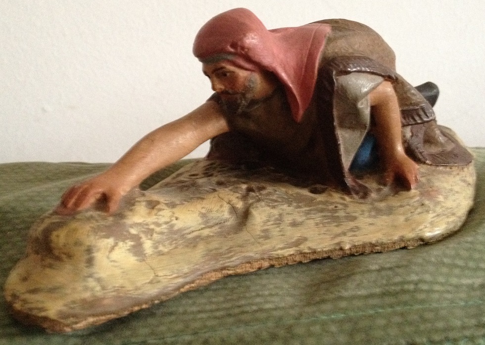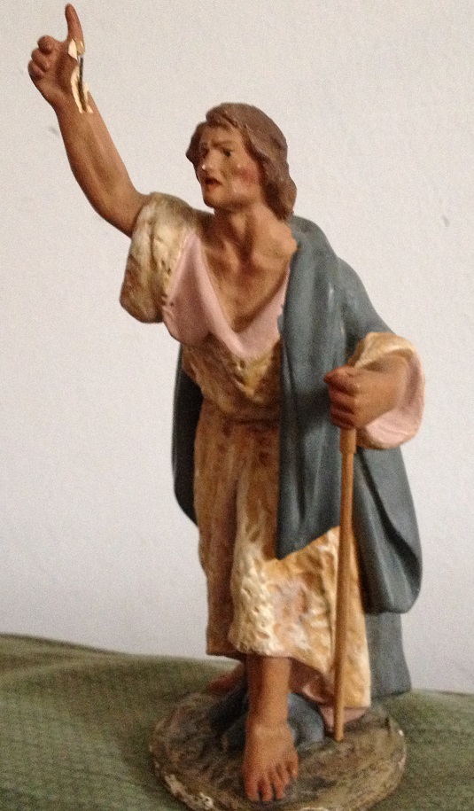 Entre los pastores me resulta muy curioso el siguiente por la postura que tiene, ¿podría ser un pastor postrado adorando o asustado por el ángel de la anunciación?