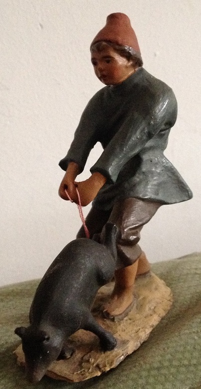La figura del cerdo esta basada en un amadeu,yo diria que es copia exacta, de ahi su calidad. Lafigura que se arrastra no se ve bien del todo,parece que llevecapa lujosa, entonces seria un rey mago prosternado, si no es eso, es un pastor de anunciata junto al fuego oadorando prosternado.