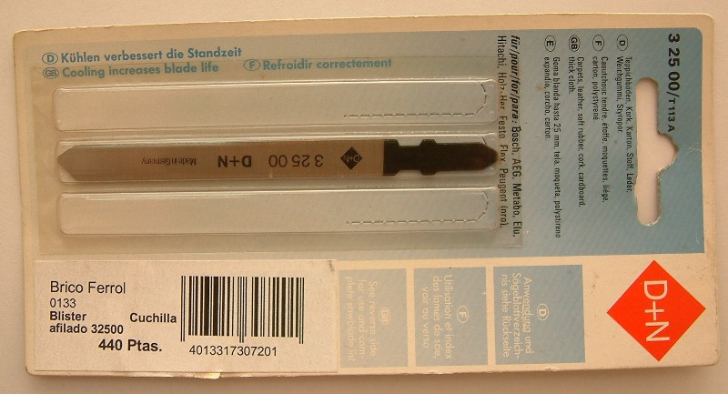 Viendo este post de Josefo me he acordado de que hace bastante tiempo, en un trabajo de maquetismo industrial utilicé estas hojas sin dientes para cortar curvas de nivel en corcho natural laminado, y el resultado era excelente, y buscando por casa encontre un blister de esa época sin usar.