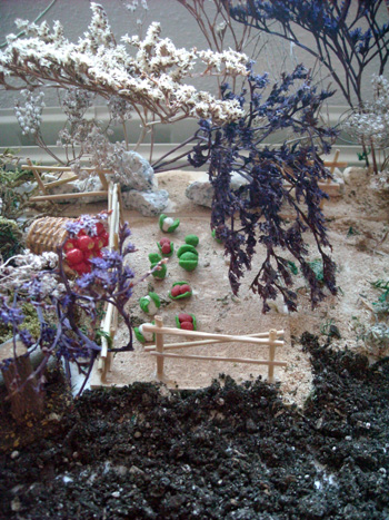 e cogiddo abono para plantas y e formado una especie de cuadrado con surcos, y en los surcos e pues mis creaciones de verduras, zanahorias, coles, lechugas, puerros, tomateras.... y queda muy bonito, ademas de que tengo cerca un lago de mi belen y e aprobechado para poner desde la noria un canalon para que llegue asta una alberquita que tengo desde donde se supone que cogen el agua para regar, y todo me a quedado muymbien,