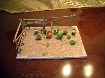 e cogiddo abono para plantas y e formado una especie de cuadrado con surcos, y en los surcos e pues mis creaciones de verduras, zanahorias, coles, lechugas, puerros, tomateras.... y queda muy bonito, ademas de que tengo cerca un lago de mi belen y e aprobechado para poner desde la noria un canalon para que llegue asta una alberquita que tengo desde donde se supone que cogen el agua para regar, y todo me a quedado muymbien,