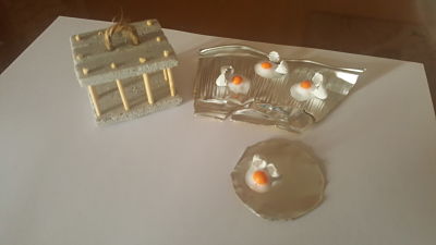 Huevos en miniaturas realizado con cola de pegamento blanca y la yema realizada con arcilla de poliamida de color nada, también se puede realizar con otro material. Queda muy original para cualquier escenografia