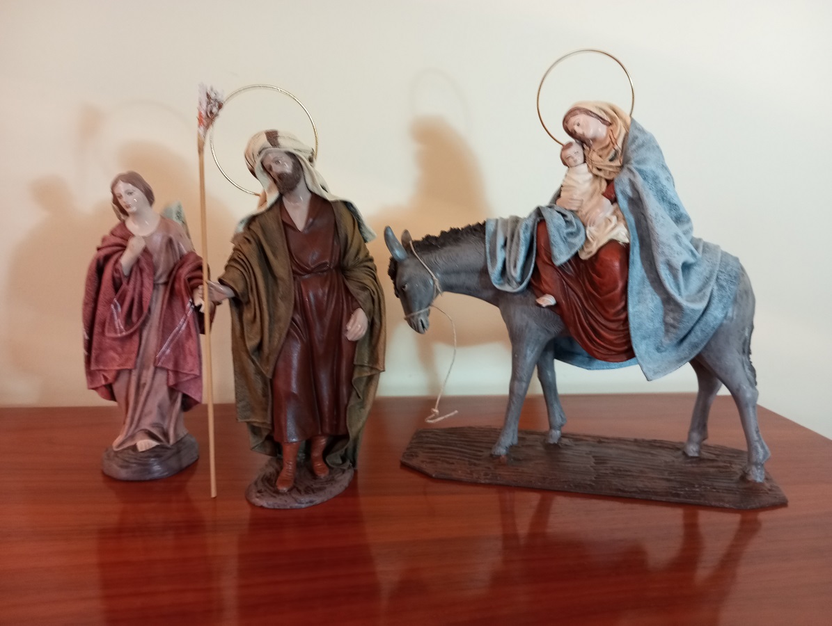 Vendo grupo Huida a Egipto de barro con telas encoladas para figuras de 21 cm de altura. En muy buen estado, no tiene ninguna rotura ni faltas en su policromía.