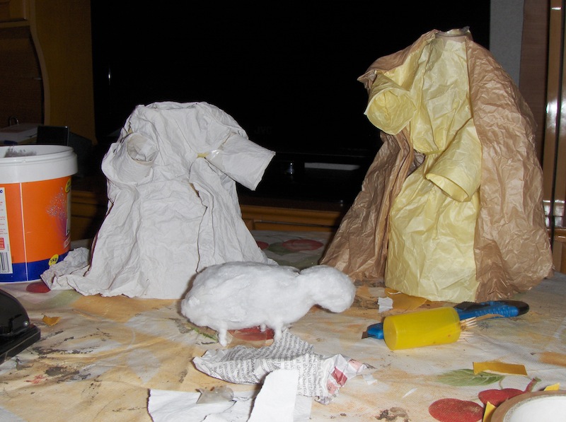 Se que a estas alturas de año, los que trabajan en colegios o centros frecuentados por niños, se rompen la cabeza para hacer algo nuevo en su belén. Aquí os pongo lo que hemos preparado mi esposa y yo para su cole este año. El cuerpo de las figuras está hecho con "canutos" de los rollos de papel de cocina incrustados en vasos de plástico de los que salen en las máquinas de café. Luego les hemos dado forma con papel de envolver y para los vestidos hemos usado recortes de papel de seda y pinocho, pegados entre sí con cinta adhesiva de doble cara. Para las cabezas, cascarones de huevos vacíos pintadas con acrílicos, ceras y rotuladores; trozos de cartulina para las coronas y algodón para las cabelleras y barbas de los reyes. La cuna del Niño está hecha con palitos pegados con silicona caliente y un retal de peluche blanco de otros trabajos; la cabeza del Niño es una bolita de "porespan". No recuerdo muy bien como se adjuntaban las fotos, espero poder hacerlo. Deseando que os pueda ayudar, recibid mi afectuoso saludo de Paz y Bien.