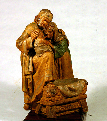 Necesitaria vuestra ayuda para averiguar el nombre del autor de este nacimiento. Lo adquirí hace bastante tiempo en un mercadillo de brocantes en Banyoles (Girona) y hasta el momento no ha sido posible identificarlo. Es de barro y mide 30 centímetros. No lleva firma ni signo alguno que nos dé alguna pista.