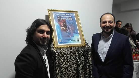 LEOPOLDO MARTIN de Coslada (Madrid), posando con la figura y Miguel Ángel Tejero hace la entrega como parte organizadora y dirección del Grupo Artes Belenistas.