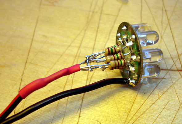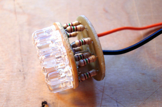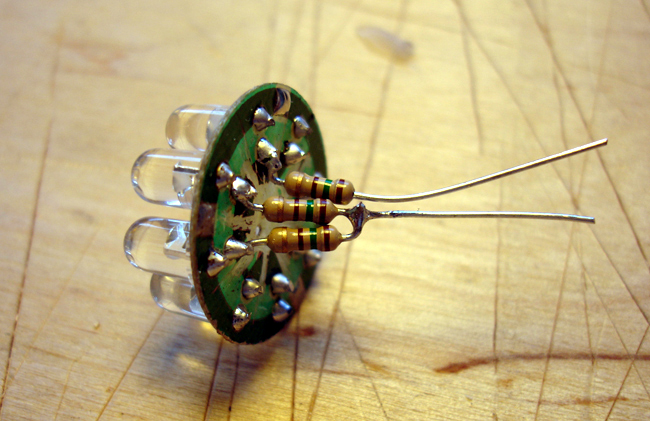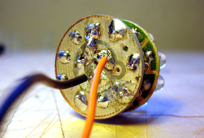En la linterna de prueba 2006, la solución está facilitada por la existencia de dos coronas que reúnen las alimentaciones a las dos patillas de los LEDs.