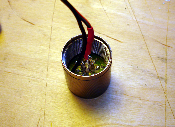 Ya podemos montar de nuevo la linterna, y conectarla al alimentador regulado a 6V, sin preocuparnos de la polaridad, como ya hemos indicado en posts anteriores (siempre que se hayan seguido las instrucciones de montaje dadas)