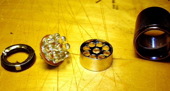 En este tipo de linternas, que son las que verdaderamente nos interesan, no existen las dos coronas internas que hemos visto en la anterior. Aunque algunas están hechas con componentes roscados el acceso a las conexiones originales es difícil y siempre se termina destrozando parte de los internos, con lo que solo se puede conservar la última corona, la más cercana a los LEDs. En el caso de las linternas de diseño embutido, la de la izquierda en la foto 082, el peligro adicional consiste en que es fácil destrozar la primera corona, con lo que no tiene modificación posible. El proceso, siendo similar al anterior, tiene los pasos siguientes.