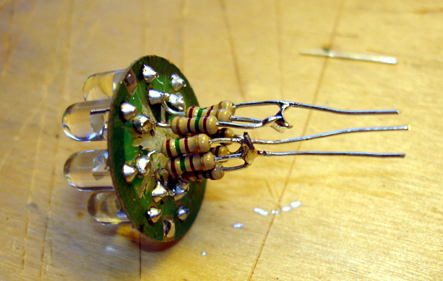 En la linterna de prueba 2006, la solución está facilitada por la existencia de dos coronas que reúnen las alimentaciones a las dos patillas de los LEDs.