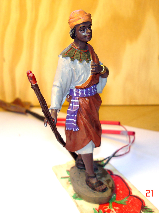 Y naturalmente yo no inventé esto. Lo vi hace varios años en un Belén monumental, con unas figuras tamaño ad-hoc. Yo acaba de comprar la primera edición de Del Prado y se me ocurrió imitar la escena con el tamaño 11cm. La escena monumental utilizaba unos pequeños farolillos de luz fija, que el cada paje sujetaba en el extremo de un bastón. Yo no podía hacer lo mismo por la escala a la que tenía que trabajar y tuve que modificar la escena monumental por otra ligeramente distinta.